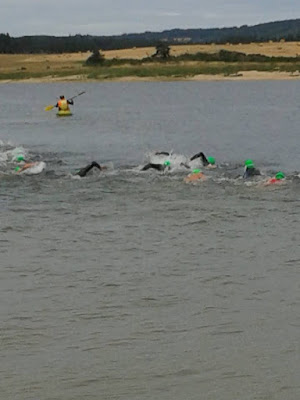 Alors qu'avec Carmelo on attend le départ en plein discussion de comment ne pas avoir de buée dans ses lunettes... Pan!! le départ est donné... Sans réfléchir je me jette à l'eau mais pendant quelques secondes je ne sais plus ou je suis et ce que je suis venu faire... 1000m soit un aller retour sur la plage d'en face avec une sortie à l'australienne... Faut que je vise les bottes de foins dans le pré au dessus de l'oriflamme... Un gars avec une combi orange fluo... C'est facile à repérer... A ma gauche une gars qui brasse et qui avance aussi vite que moi... Je me concentre et prend mon rythme de croisière... Sortie à l'australienne les gars devant moi marchent !!! Moi je tente de courir du coups je raccroche plus ou moins le groupe... Allez plus que 500 m... J'ai l'impression de nager tout tordu... Le gars en fluo est devant mais beaucoup plus à gauche... J'essaie de m'orienter un peu mieux... Enfin on sort de l'eau... 1000m en fait ça me va bien!!! Je jette un coup d'œil à ma montre 16'30 cool !! J'avais visé 20'... J'ai plein de supporters Cyril, wouafette, Muriel avec son appareil photo... Nicole/Serge &co'...